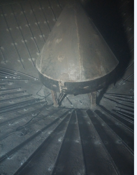 d.在大型钢板仓,大型钢板库的出料系统中,最主要的是钢管库库内的气动扫料管道装置,它是由DN250型无缝钢管,钢管的分布为由中心向外呈条形辐射分布排列。气运管道安装在距钢管库库底的平行距离为20cm,它是由四个不同的压力区域管道组成。由中心区向外压力逐渐增强,最为关键的是扁嘴式压力喷头。在气化管和螺旋料出料机的作用下,水泥或其他储物出库排空率基本达到了80%左右。这时出料的主要作用全部由气动管道的高压喷嘴来完成。大型钢板库库底的水泥在高压喷嘴的作用下,逐步被螺旋出料机送出库外,最后高压喷嘴像扫把一样会把各个角落的水泥全部送到螺旋出料机的入口。